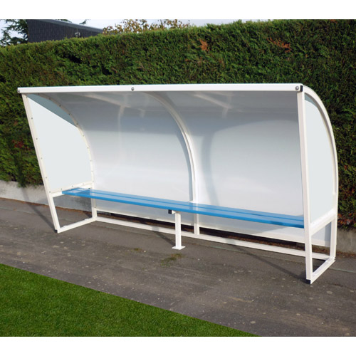 acier galvanisé à chaud et plastifié en blanc pour le toit et l’arrière et un revêtement en polycarbonate transparent sur les cotés pour une vision maximale de jeu, des joueurs ou de l’entraîneur.