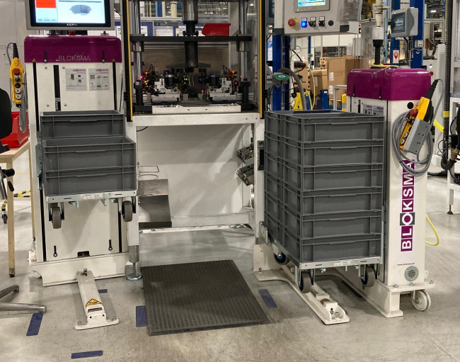 Nos élévateurs Bloksma, dépileurs empileurs de bacs, sont disponibles en version électrique et pneumatique, équipés de capteurs de mise à niveau constant, réglables en hauteur (avec fonction anti-écrasement) et de capteurs de présence d'embases en option.