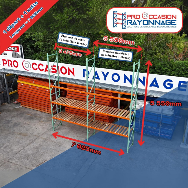 Ce lot de rayonnage d'occasion est idéal pour équiper vos entrepôts, ateliers ou commerces. D'une hauteur de 5 500 mm, d'une longueur totale de 7 025 mm et d'une profondeur de 1 000 mm, il offre une capacité de charge de 2.4 tonnes par niveau, pour un stockage sécurisé de vos marchandises.