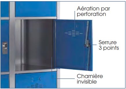 Les portes ventilées sont perforées afin d’optimiser la circulation de l’air, empêchant la stagnation d’humidité et assurant la préservation des effets personnels des élèves.
