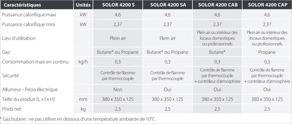 Le modèle SOLOR 4200 CAB est conçu pour une utilisation en plein air ou à l'intérieur lorsque la température ambiante est supérieure à 10°C. Vous recevez votre appareil avec un détendeur fixe gaz butane, garantissant une installation sécurisée et conforme aux normes.