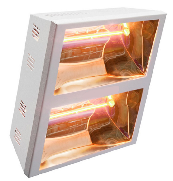 D'une puissance de 3000 ou 4000 Watts, cet appareil peut être fixé au mur ou au plafond, et comprend des boutons pour l'allumage séparé des lampes.