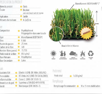 Ce gazon est conçu à base de fibres frisées, des matériaux de fabrication vierges d’une excellenterésistancemécanique, permettant la durabilité et la résistance aux utilisations fréquentes.