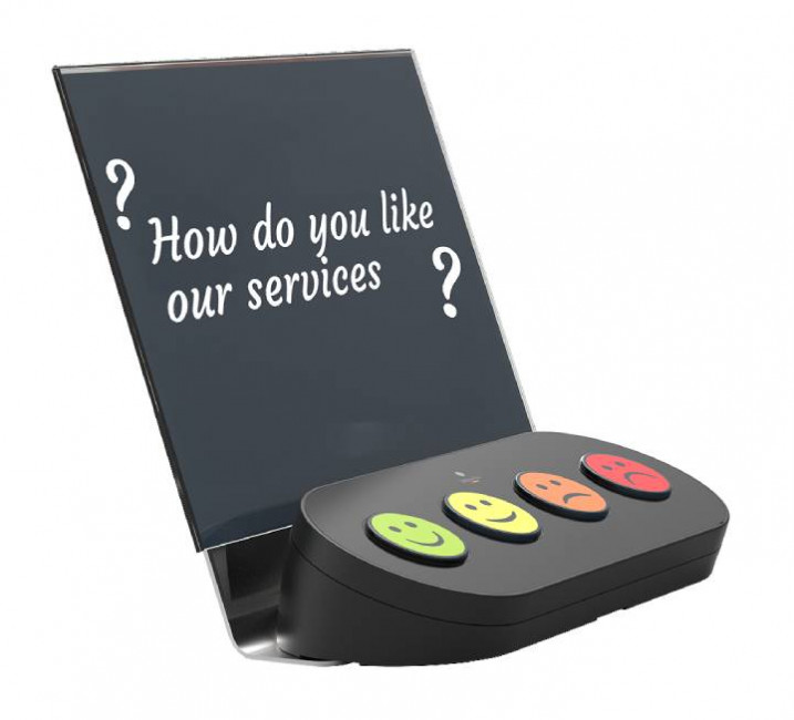 Placé sur un comptoir, il permet aux utilisateurs de répondre rapidement à une question de satisfaction en appuyant sur un bouton.