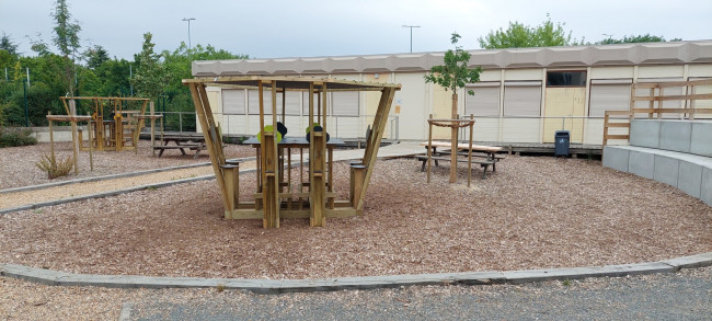 Il est possible de compléter votre table de classe d'extérieur par une rampe d'accès dédiée aux personnes à mobilité réduite, mais aussi de nombreuses autres options : toile brise vent/ brise vue, cadran solaire, plaque de cuisson (utile au chargement des téléphones, ordinateurs, tablettes), plateaux jeux, coussin pour le confort, tabourets pour plus de places.