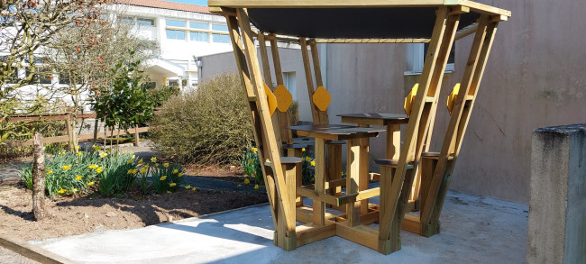 Cet ensemble table et chaise jardin peut s'intégrer dans tous les environnements extérieurs de votre école.