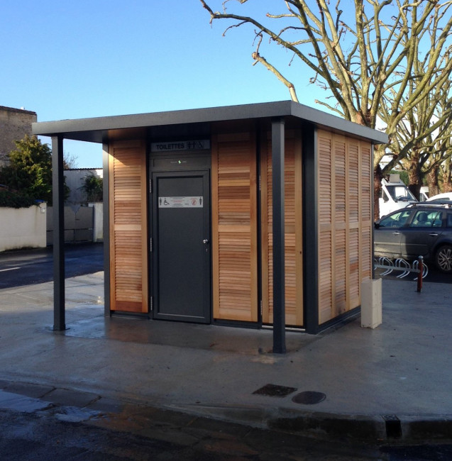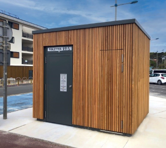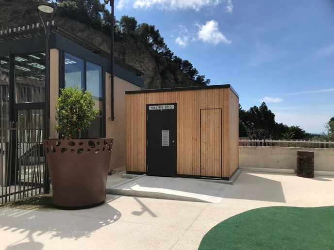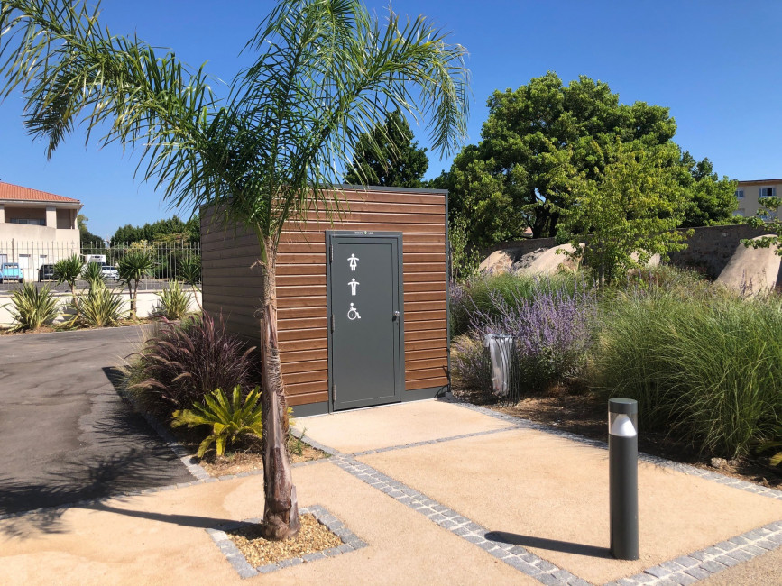 Cette cabine sanitaire prête à poser est dotée d'un système automatique qui assure le nettoyage et la désinfection de l'installation à chaque passage.