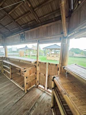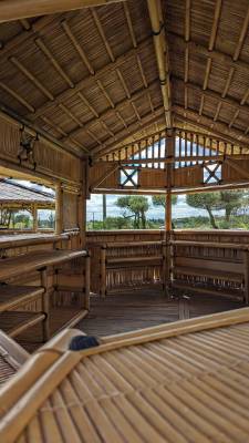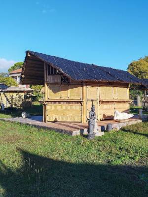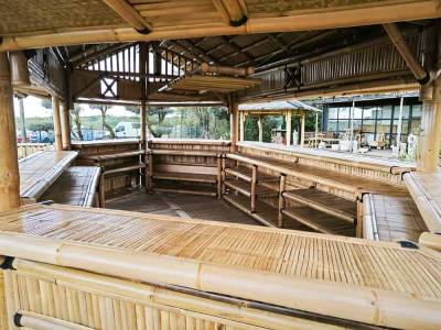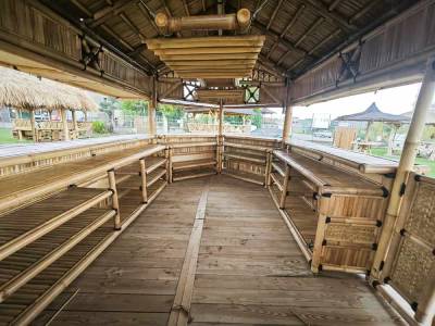 Grâce à sa toiture en chaume résistante aux intempéries et son ossature robuste en bambou naturel, notre structure bambou sur-mesure s’adapte à un usage en extérieur, quelles que soient les conditions météo.