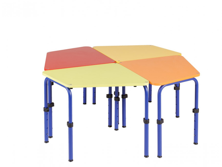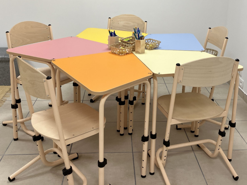 La forme ingénieuse du plateau permet diverses compositions : les tables 3.4.5 peuvent être utilisées en ligne ou regroupées par 3, 4 ou 5 (ou plus) pour former des groupes cohérents, répondant aux besoins pédagogiques spécifiques.