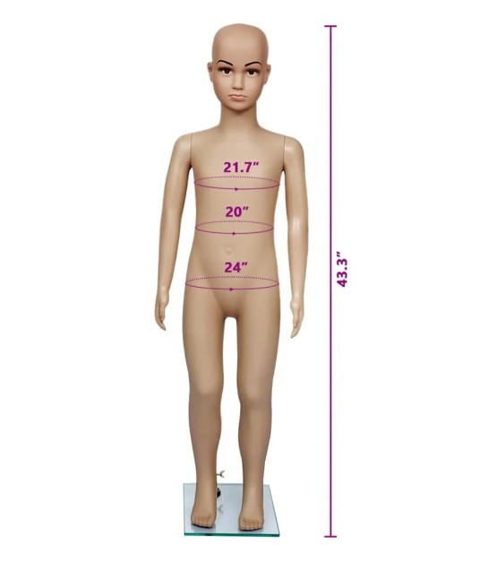 Le buste de 55 cm, la taille de 51 cm et les hanches de 61 cm reproduisent fidèlement les proportions enfantines pour un rendu réaliste de vos vêtements.
