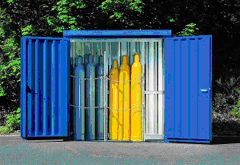 - Conteneurs spécialement conçus pour le stockage des bouteilles de gaz, équipés de porte-bouteilles pour les maintenir debout.