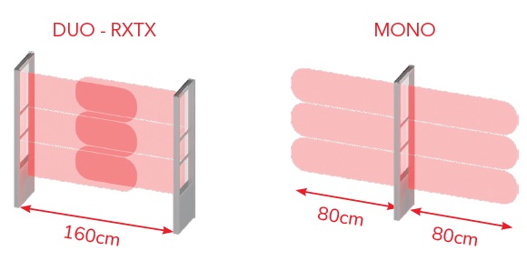 - Portée maximale de détection entre 2 antennes (Duo) ou de chaque côté (Mono) : Voir ci-dessus
