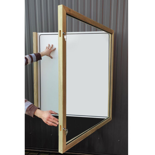 Demande de prix pour 1 cadre H 1150* L 1000 avec 15 formats A4 , pin traité autoclave classe 4 encadrement section 46*46 mm ouvrante vitre polycarbonate 3 mm joint d"étanchéité charnières inox serrure clé et fond de tôle blanc magnétique sur PVC blanc 10 mm