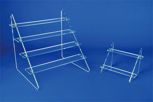 Ce présentoir en escalier est fabriqué en plexiglas coulé, découpé puis plié à chaud.