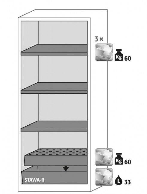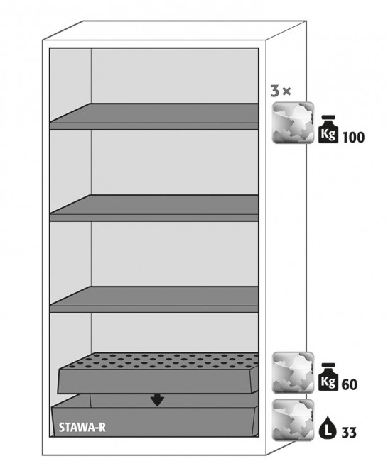 Équipée avec :3 x étagère, 1 x caillebotis, 1 x bac de rétention au sol (V=33L)
