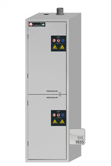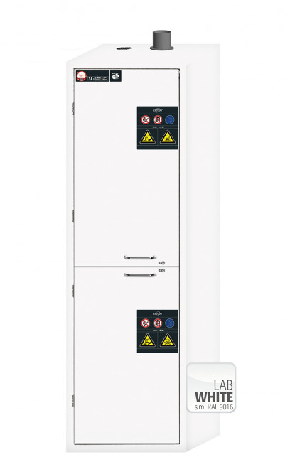 Les acides et les bases peuvent être stockés ensembles dans l´armoire mais seront séparés. Deux compartiments de stockages hermétiques grâce à une paroi verticale ou horizontale. Système d´aération et d´évacuation intégré, résistant à la corrosion et sans métal.