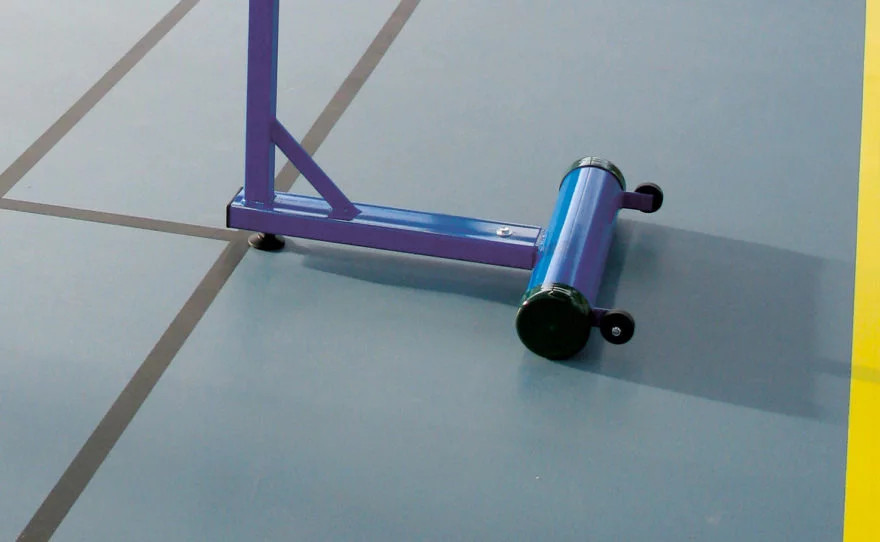 Le socle en acier plastifié est prévu pour être rempli de sable et ainsi lester les poteaux de badminton mobiles sans fixation au sol, ce qui simplifie l’installation dans les salles polyvalentes.