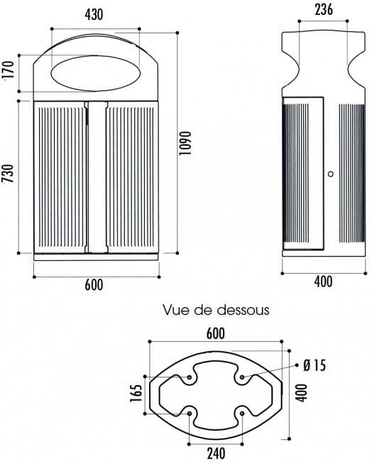 Capacité : 80 L Polyéthylène, 100 % recyclable Dimensions : H. 1090 x l. 430 mm Fixation au sol par vis d’ancrage