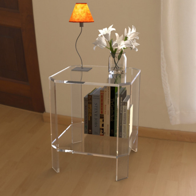 Plexiglas épaisseur 1.5 cm Plateau : 50/50 cm tronqué aux angles sur 10 cm Hauteur : 60 cm Tablette à 15 cm du sol