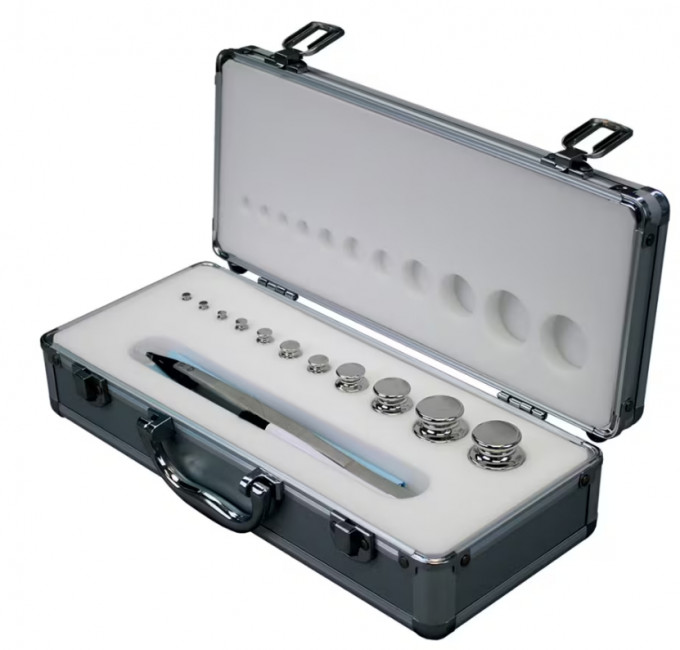 Le coffret de masses en acier inoxydable, disponible en versions 1 mg à 200 g ou 1 g à 200 g, est soigneusement rangé dans un coffret robuste en aluminium assurant protection et facilité de transport.