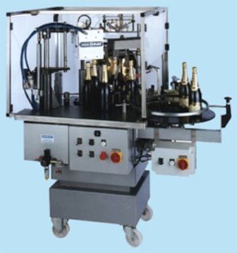-Cette machine est munie d'un groupe d'habillage compact sur roulettes, à chargement déchargement manuel et prévu pour le capsulage et l'étiquetage automatique des bouteilles de champagne.Le plissage de la capsule placée manuellement sur la bouteille et l'application de la collerette et de l' étiquette sont effectués en un seul passage.