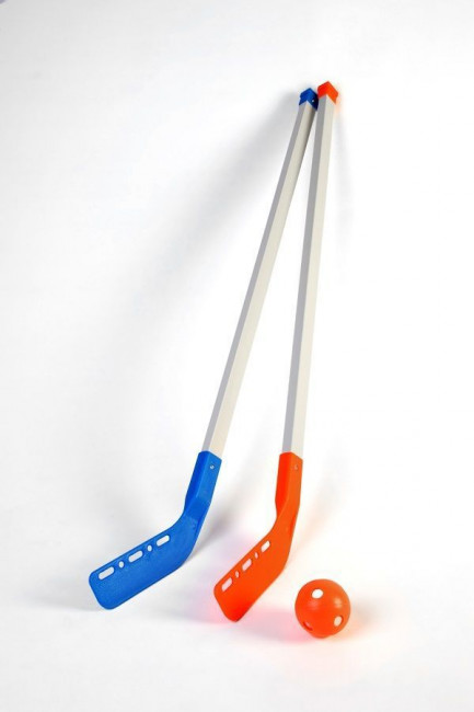 Il est composé de 6 crosses de hockey en plastique de 2 couleurs différentes, 3 balles Ø 6 cm et 3 palets Ø 6.5 cm