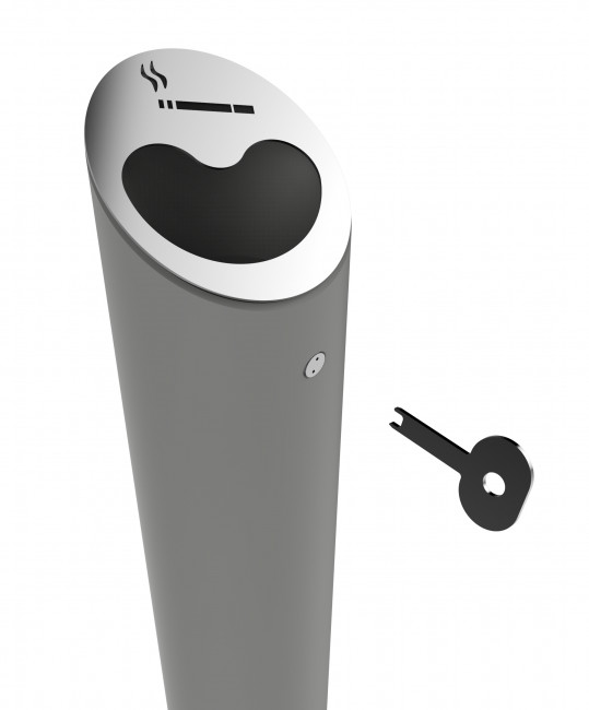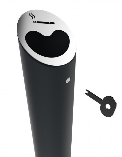 Sa forme cylindrique et sa finition anthracite mat RAL 7016 ou gris alu RAL 9006 lui permettent de s’intégrer discrètement à tout environnement : façade d’entreprise, parvis d’immeuble, aire fumeur ou zone de stationnement.