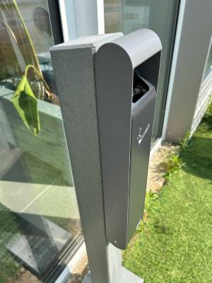 Le corps du cendrier est en acier galvanisé époxy gris anthracite, avec bac intérieur galvanisé amovible.