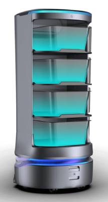 Ce robot de transport autonome supporte jusqu’à 60 kg et dispose de 4 niveaux de bacs totalisant 120 litres de capacité.