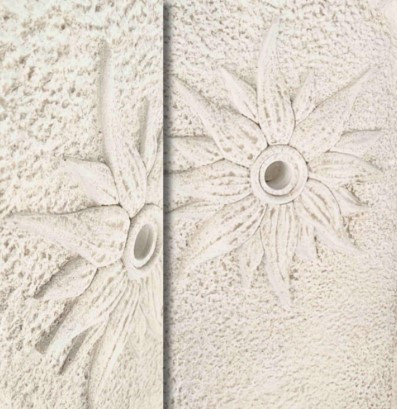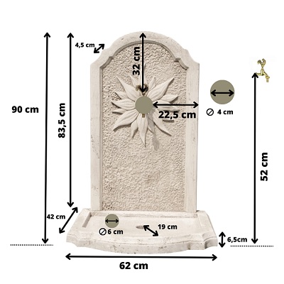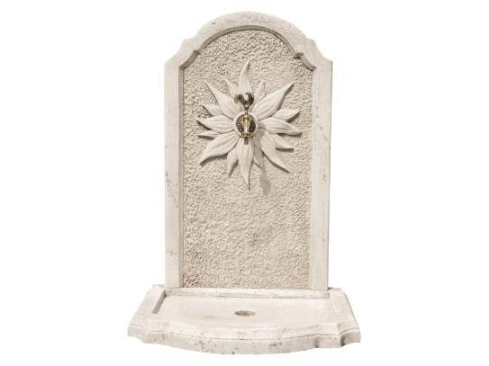 Grâce à son fronton orné d'un magnifique soleil en sur-épaisseur, cette fontaine murale attire tous les regards.
