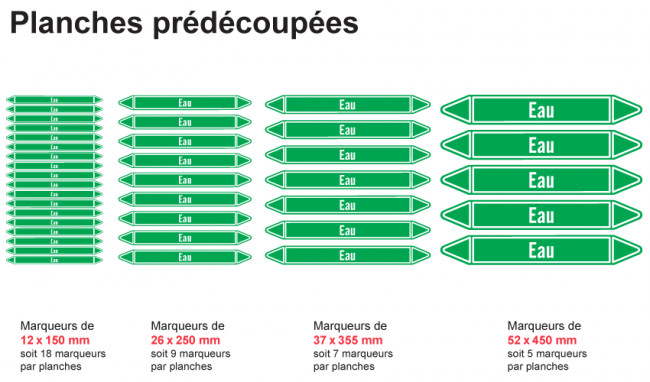 Plusieurs tailles de marqueurs de tuyauterie en continu vous sont proposées :