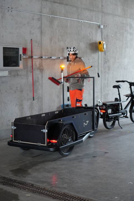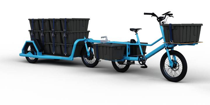 Vous pouvez l’utiliser seul (100 kg et 300 L de charge) ou l’équiper d’une ou deux remorques pour former un véritable wagon vélo électrique collectif.