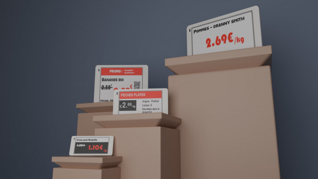 Optimisez la gestion des prix dans votre commerce grâce à nos étiquettes électroniques de gondole. Disponibles en plusieurs formats (de 2,1’’ à 7,5’’), elles s’adaptent facilement aux rayons de votre magasin pour offrir une solution moderne, durable et éco-responsable.