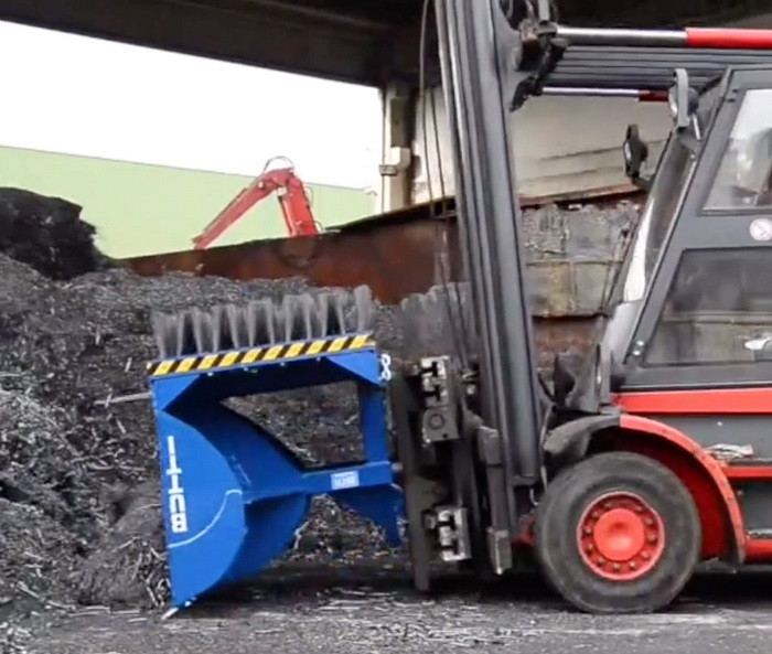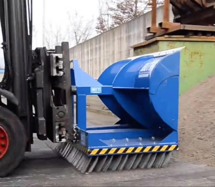 Cette brosse hydride avec godet pour chariot élévateur nettoie rapidement et efficacement de grandes surfaces intérieures ou extérieures.
