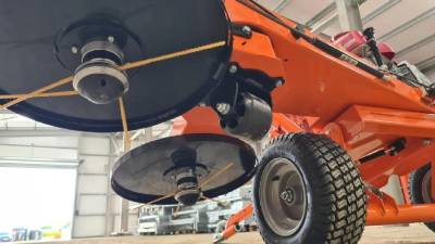 Cette faucheuse sous clôture est conçue pour être montée sur un tracteur ou un autre véhicule agricole.