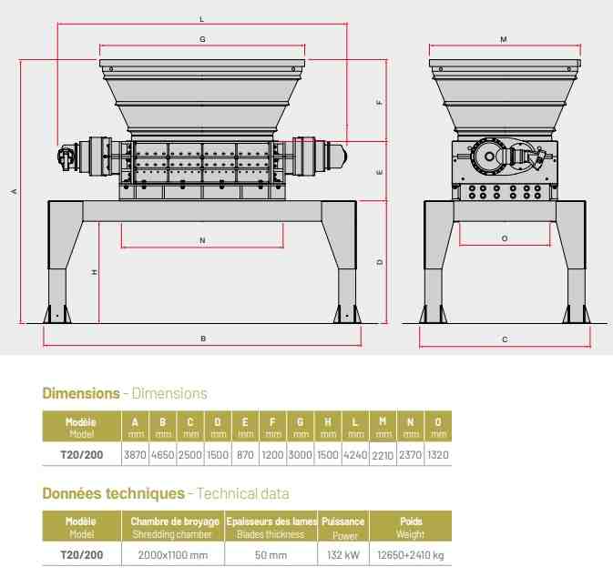 Avec une puissance de 132 kW, ce broyeur permet une efficacité maximale, tandis que sa chambre de broyage de 2000 x 1100 mm permet de traiter des volumes importants.