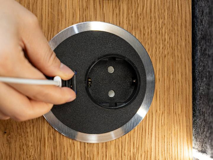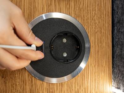 À l’intérieur, vous trouvez tout ce qu’il vous faut pour travailler dans de bonnes conditions. Deux ventilateurs assurent une ventilation active puissante (240 m³/h), pour un air frais renouvelé en continu. L’éclairage LED s’active automatiquement grâce à un détecteur de présence. Vous disposez d’une prise électrique, de ports USB-A et USB-C, d’un port HDMI et d’une station de charge sans fil pour votre téléphone. L’étagère en chêne naturel est positionnée à la bonne hauteur pour vous permettre de poser un ordinateur portable ou prendre des notes confortablement.
