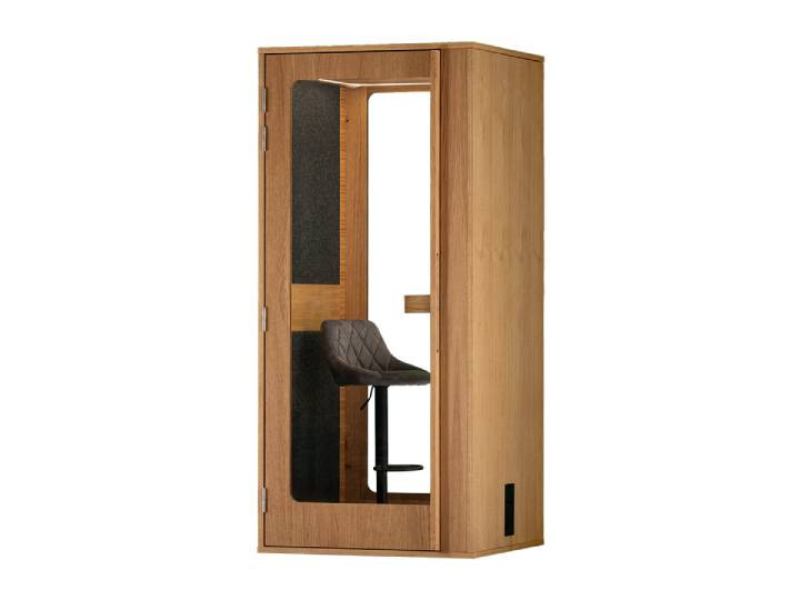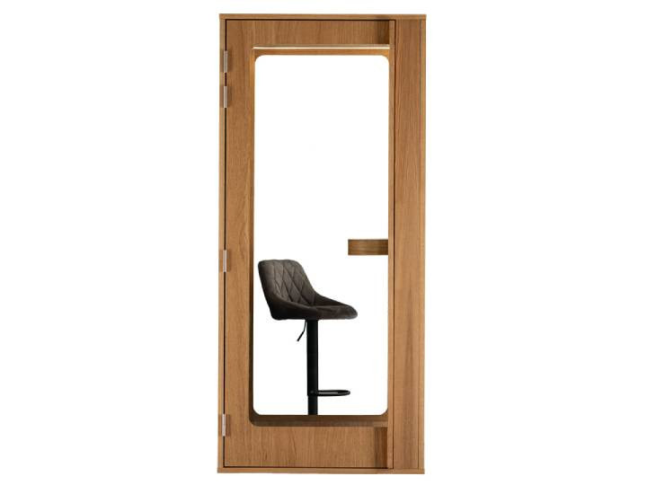 La finition extérieure en chêne naturel et la double paroi vitrée donnent un style sobre et professionnel. La porte en MDF et plexiglass permet une entrée facile, avec un passage de 74 cm de large et 202 cm de haut. Avec ses roulettes discrètes intégrées, vous déplacez la cabine sans effort si vous réorganisez vos espaces de travail.