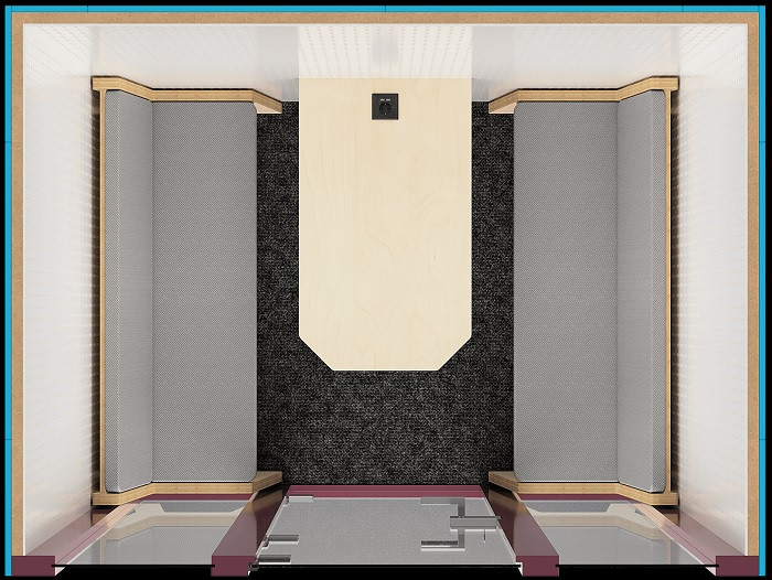 - Les parois intérieures sont tapisées de feutre acoustique gris clair ayant pour support des matériaux absorbants pour une acoustique homogène et agréable