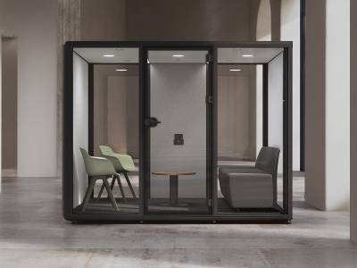 La cabine acoustique L est conçue pour accueillir jusqu'à quatre personnes, idéal pour des réunions en petit comité ou des visioconférences à plusieurs.