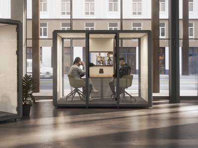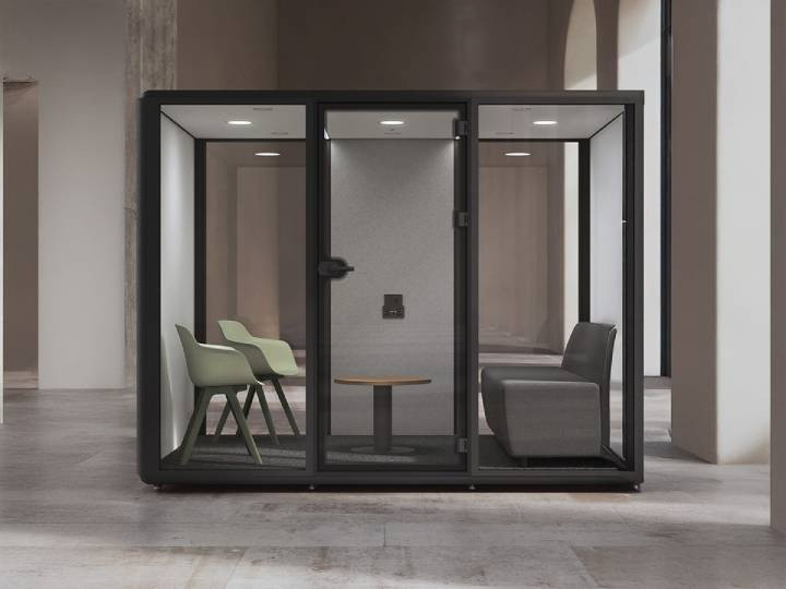 La cabine acoustique XL est la plus grande de la gamme et peut accueillir jusqu’à six personnes.
