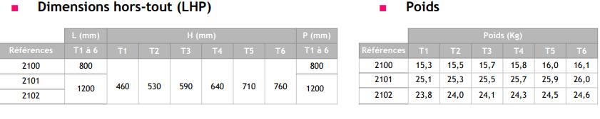T1 : 460 mm / T2 : 530 mm / T3 : 590 mm / T4 : 640 mm / T5 : 710 mm / T6 : 760 mm