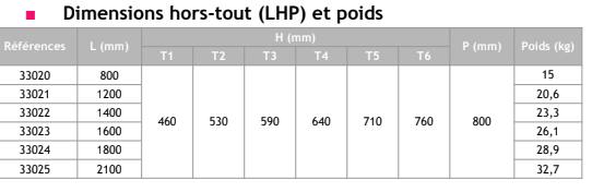 T1 : 460 mm / T2 : 530 mm / T3 : 590 mm / T4 : 640 mm / T5 : 710 mm / T6 : 760 mm
