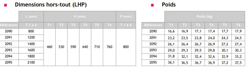 T1 : 460 mm / T2 : 530 mm / T3 : 590 mm / T4 : 640 mm / T5 : 710 mm / T6 : 760 mm