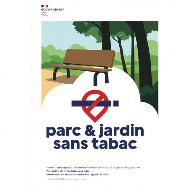 affiche autocollante « parc et jardin sans tabac », spécialement conçue pour signaler l’interdiction de fumer dans les espaces publics extérieurs et couverts.
