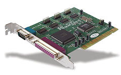 Bus PCI 32 bits. • Autorise un taux de transfert maximum de 800 Kbytes/sec. • Port parallèle compatible standard ECP/EPP/SPP/BPP. • Port série compatible UART FIFO 16C550 • Livrée avec drivers • Connectique carte SUBD25 F + SUBD9 M • Connectique sur équerre : 3 SUBD9 M • Compatible Windows 95/98/ME/2000/XP/NT