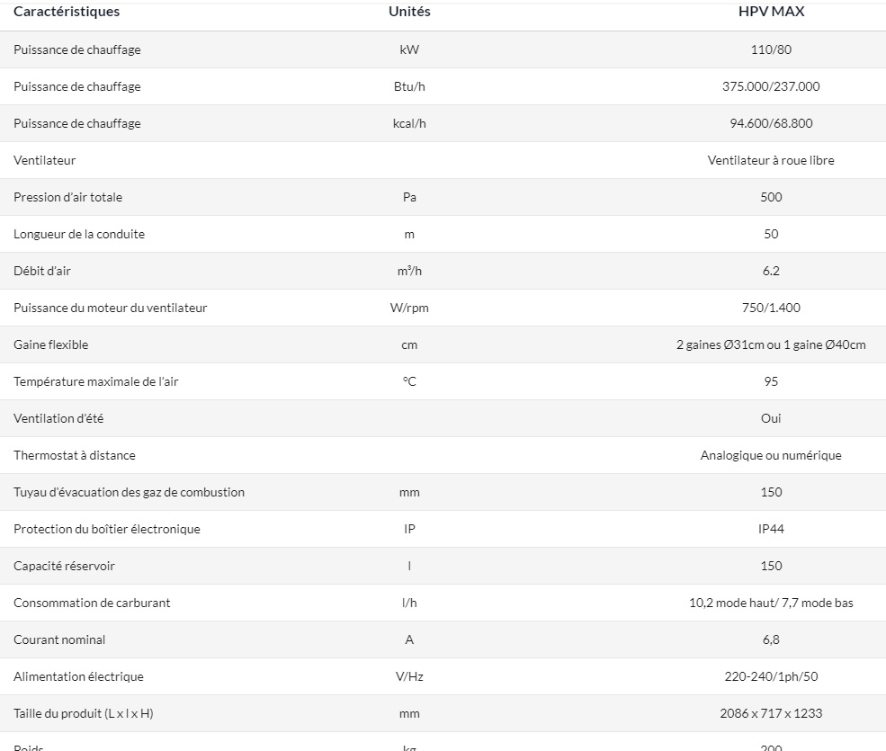 Il offre une puissance calorifique remarquable de 110 kW pour un appareil à combustion indirecte, ce qui en fait un choix idéal pour chauffer rapidement et efficacement de grands volumes.