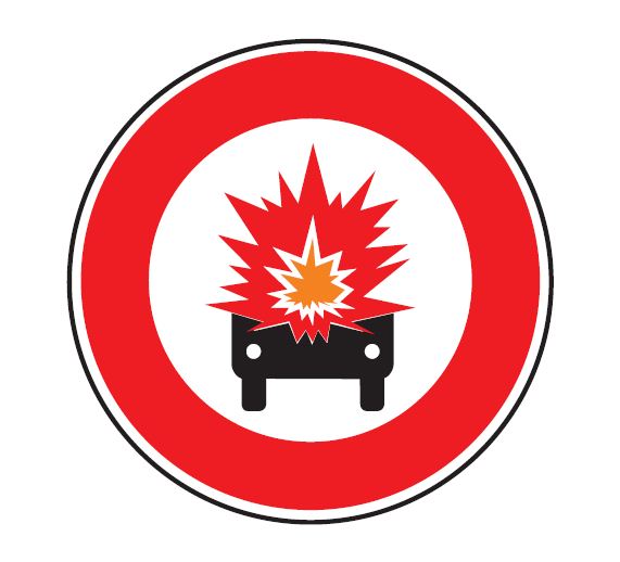Ce panneau de type B18a, fabriqué en France, indique un accès interdit aux véhicules transportant de la marchandise explosive ou inflammable.