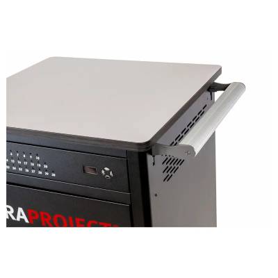 Le plateau supérieur du Trolley C30 peut être utilisé comme surface de travail d’appoint. Deux prises 220 V situées sur le côté permettent de brancher facilement un ordinateur, un vidéoprojecteur ou des périphériques. Le chariot devient ainsi un véritable outil multifonction pour vos usages pédagogiques et professionnels.