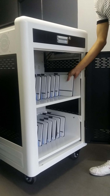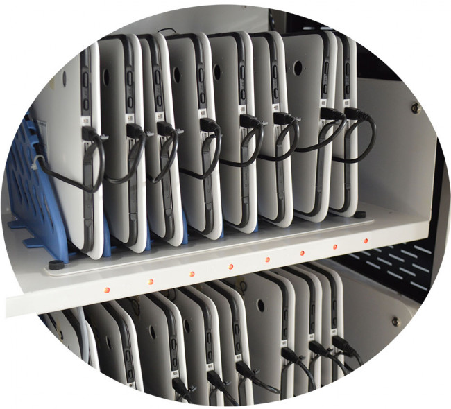 Zone technique à l’arrière (sécurisée par une porte à serrure) pour intégrer les chargeurs de tablettes et de PC à travers des rangées de prises électriques.